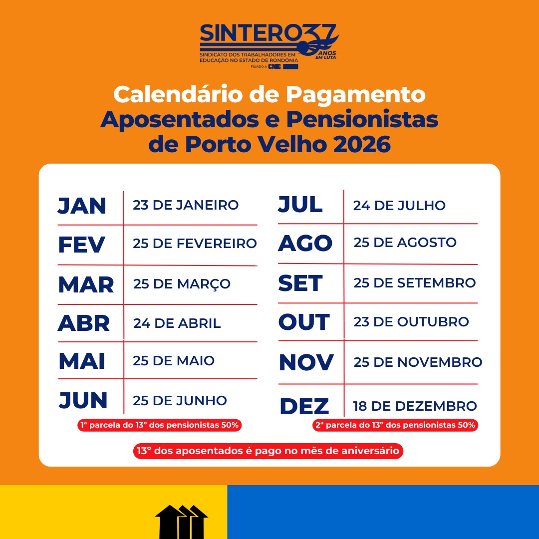 Com o objetivo de facilitar a organização financeira das servidoras e servidores ativos, aposentadas, aposentados e pensionistas, o Sindicato das Trabalhadoras e Trabalhadores em Educação no Estado de Rondônia (SINTERO) reuniu as datas de pagamento das esferas: federal, estadual e municipal para 2026. Confira abaixo as informações detalhadas de cada esfera.
