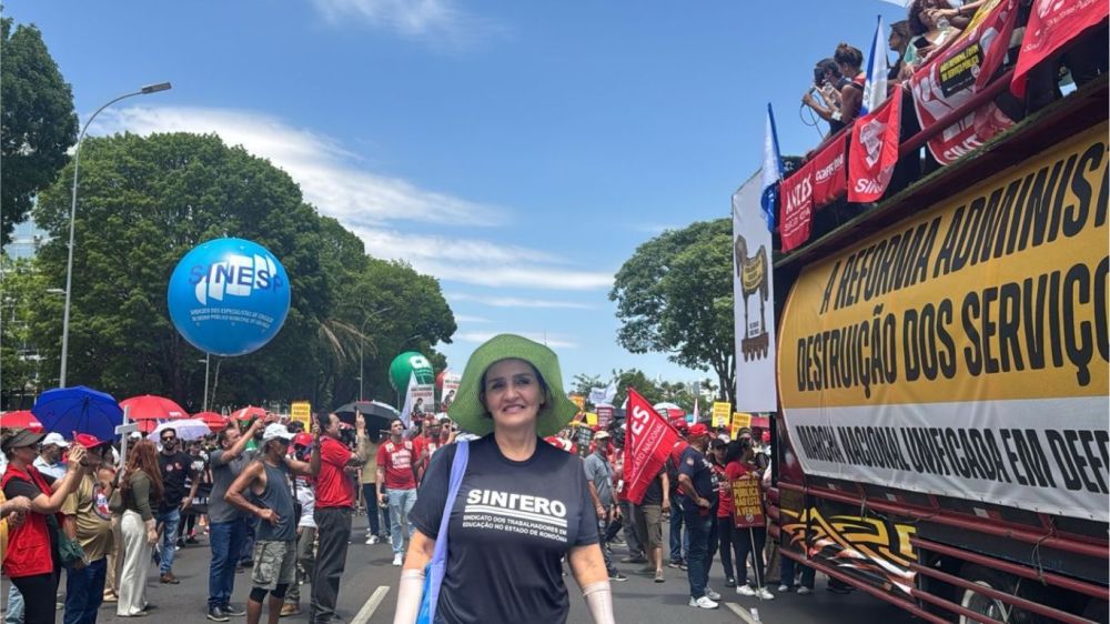 Na última quarta-feira (29), a presidenta do SINTERO, Dioneida Castoldi, participou Marcha Nacional do Serviço Público contra a Reforma Administrativa (PEC 38/2025), realizada em BrasÃlia. O ato foi convocado pela Central Única dos Trabalhadores, centrais sindicais, Confederações, entre elas a Confederação Nacional dos/as trabalhadores/as(CNTE), com apoio das frentes Brasil Popular e Povo Sem Medo.